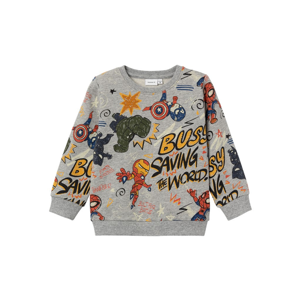 Smart Name It sweatshirt, Marvel Avengers işbirliğiyle tasarlandı. Koyu gri renkte olan sweatshirt'ün tamamında eğlenceli bir çizgi film efektiyle Kara Panter, Kaptan Amerika, Hulk, Demir Adam ve Örümcek Adam baskısı yer alıyor; The Name It sweatshirt uzun kollu olup gövde ve kol açıklıklarında geniş fitilli kenarlara sahiptir; Yaka açıklığında dar fitilli, sweatshirt'ün iç kısmı yumuşak, fırçalanmış pamuklu kumaştan yapılmıştır; - %95 pamuk; - %5 elastan;