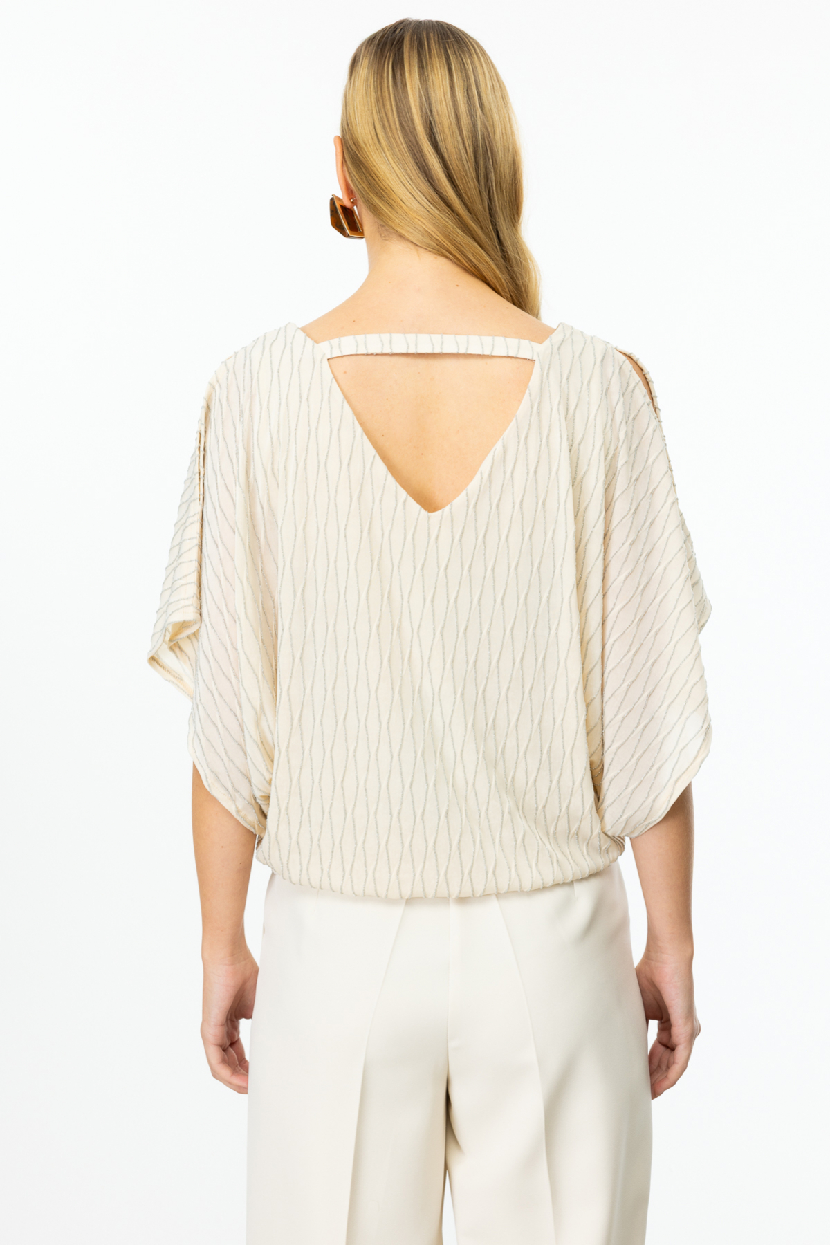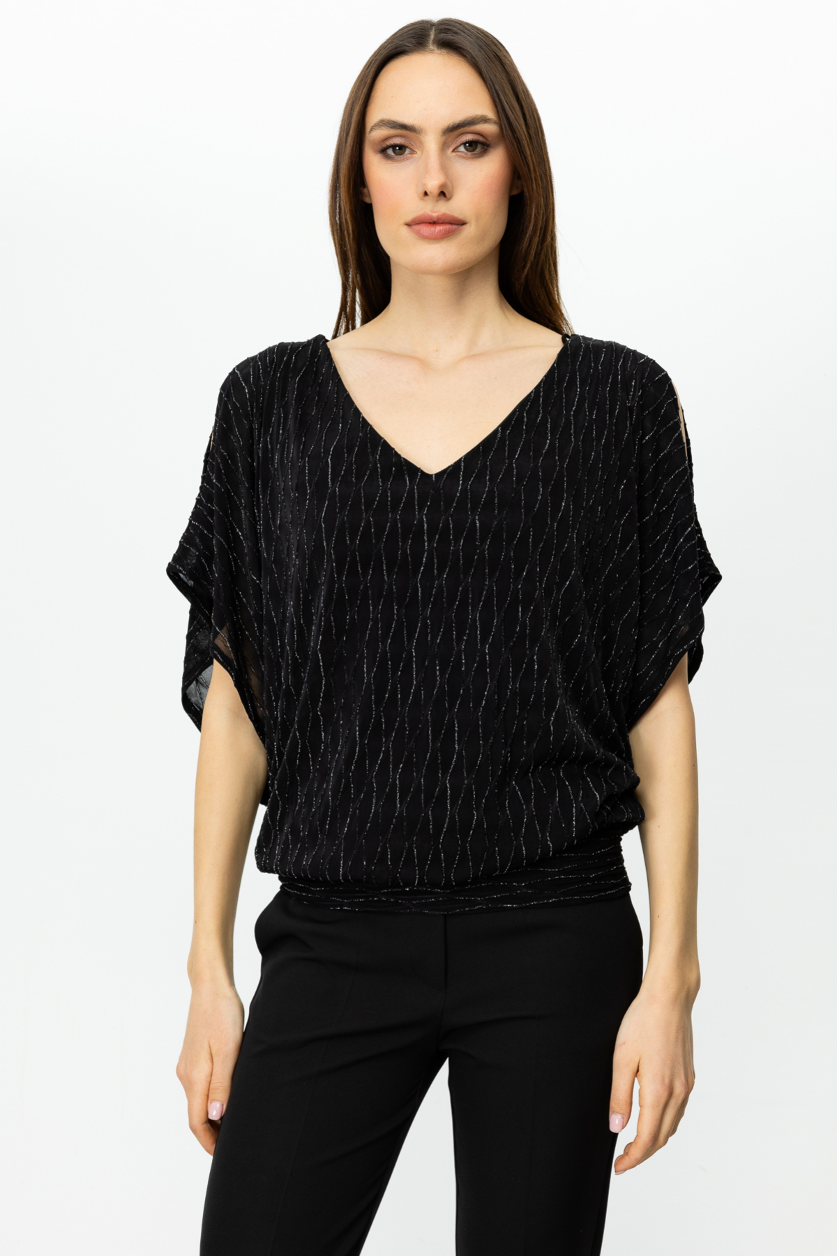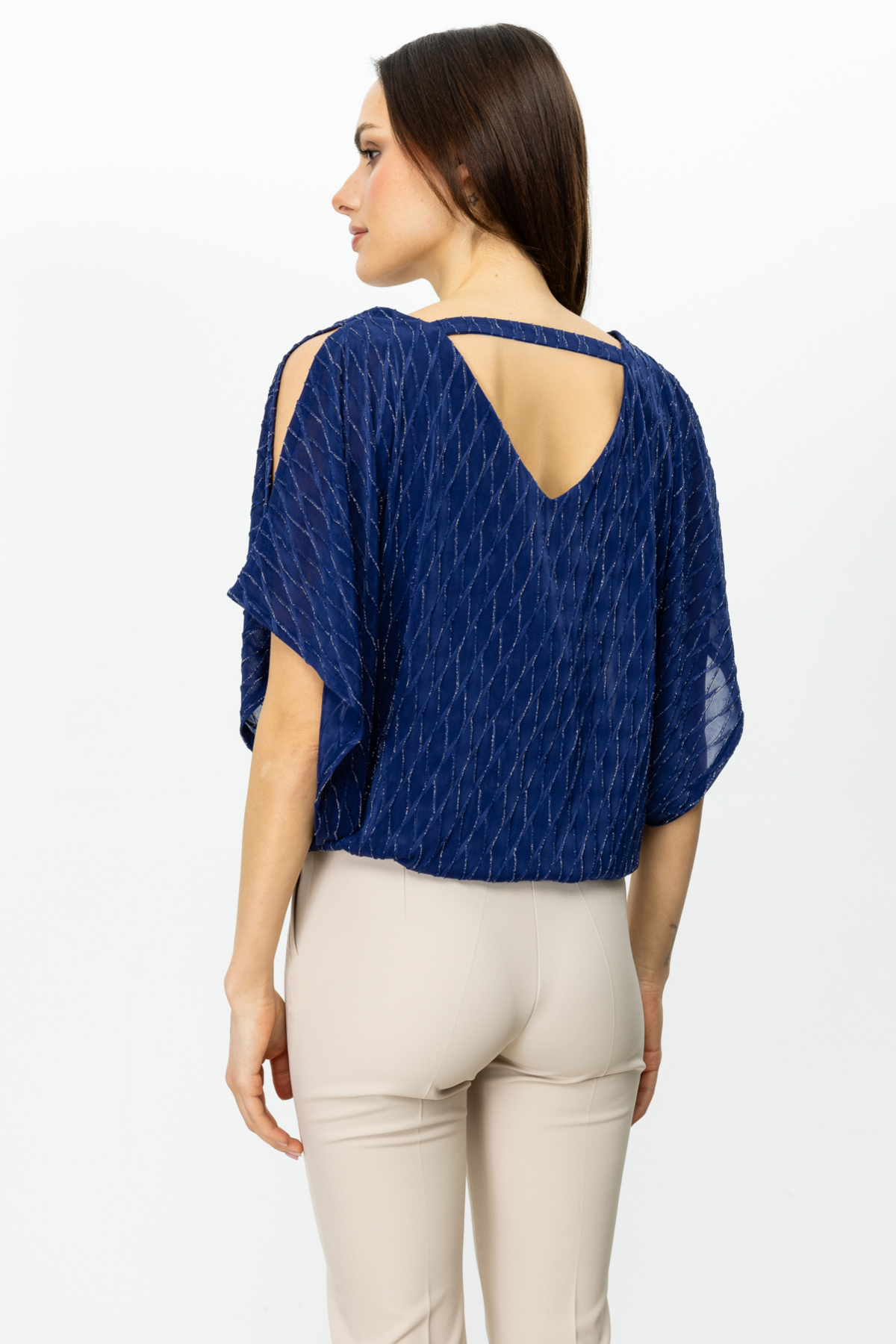 Ürün Özellikleri:V yaka, omzu açık, simli kumaş, sırt dekolteli