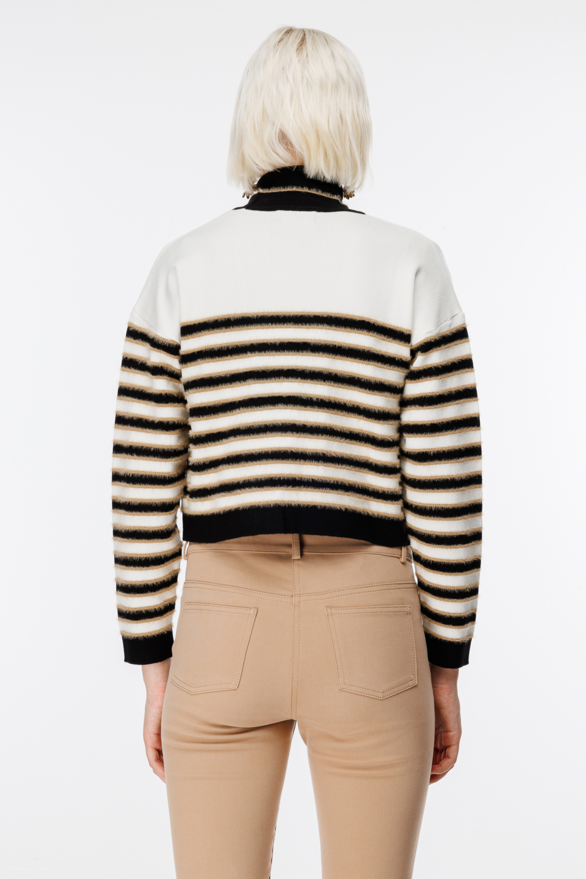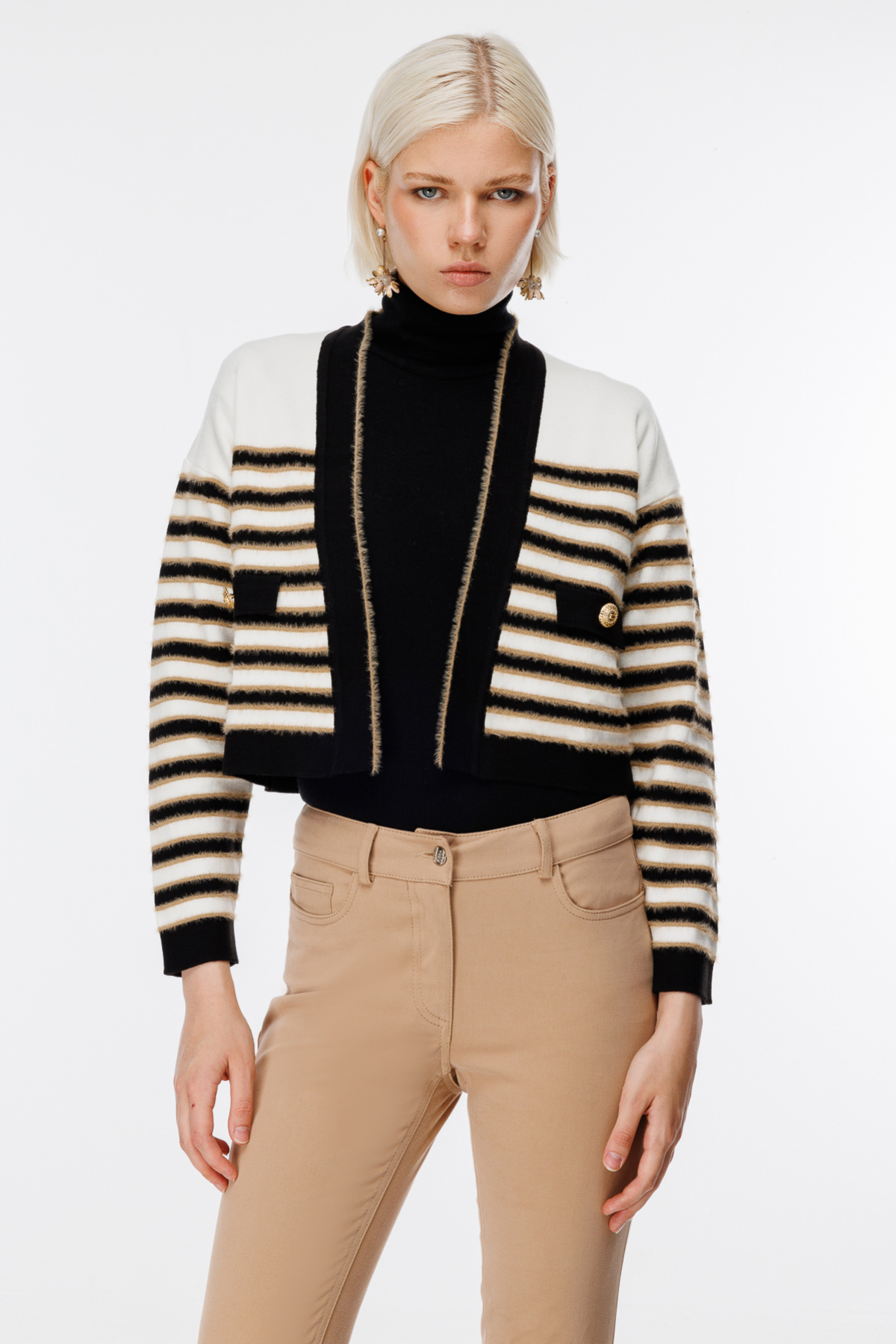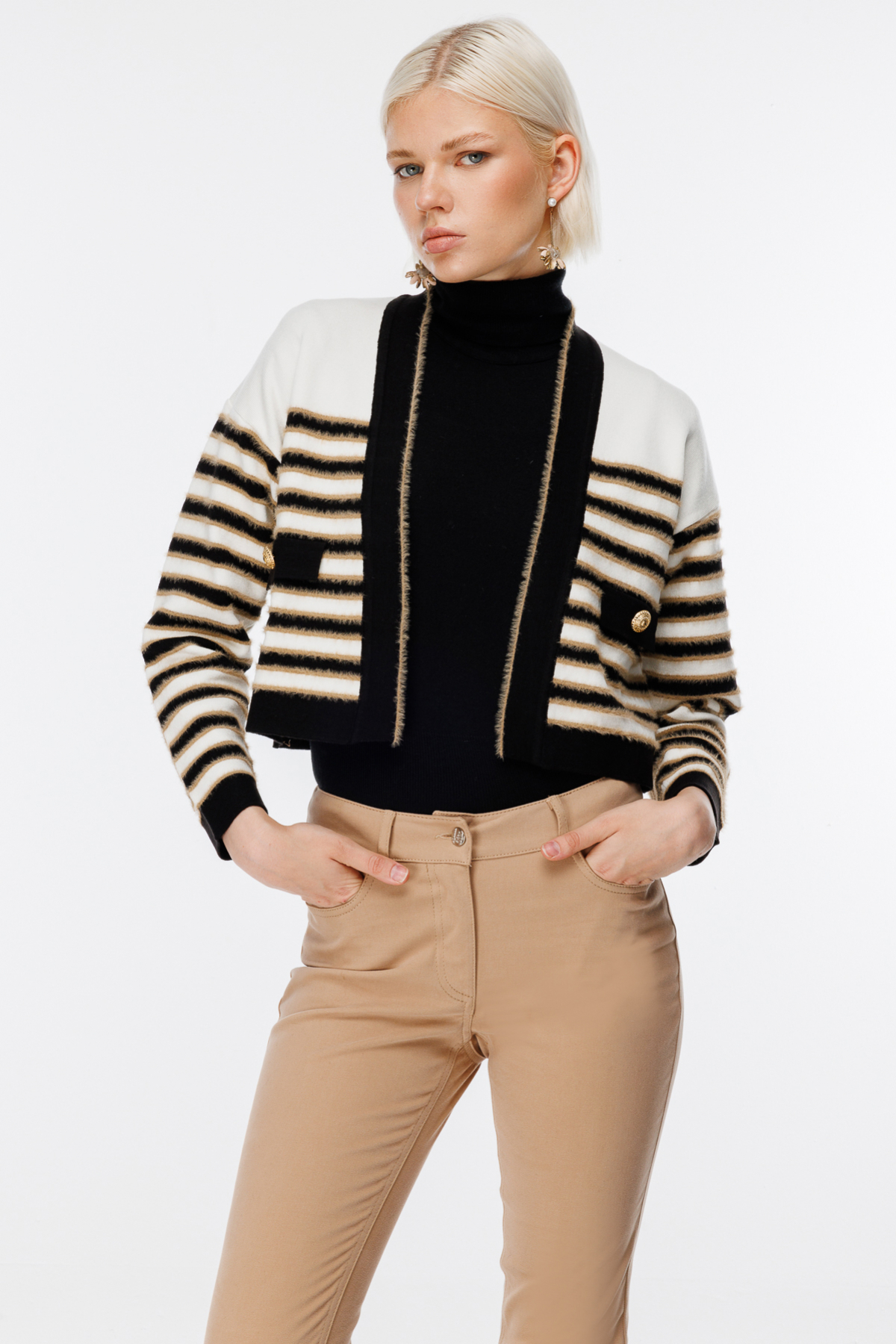 Çizgili, düğme detaylı, önü açıkÜrün Kalıbı: Tam KalıpÜrün Kalınlığı: OrtaÜrün Boyu: 45 cmKumaş İçeriği: %11elastan %15polyamid %74akrilikÜrün...
