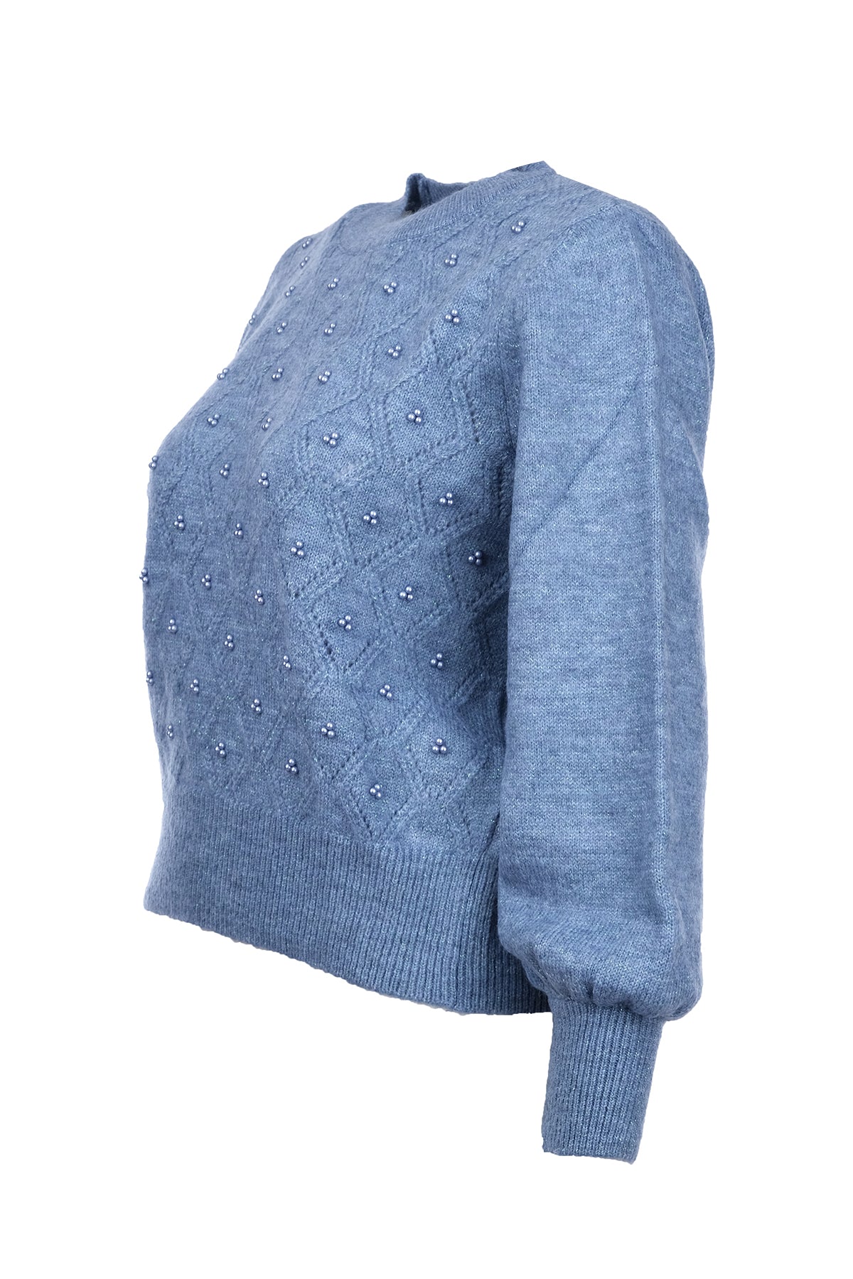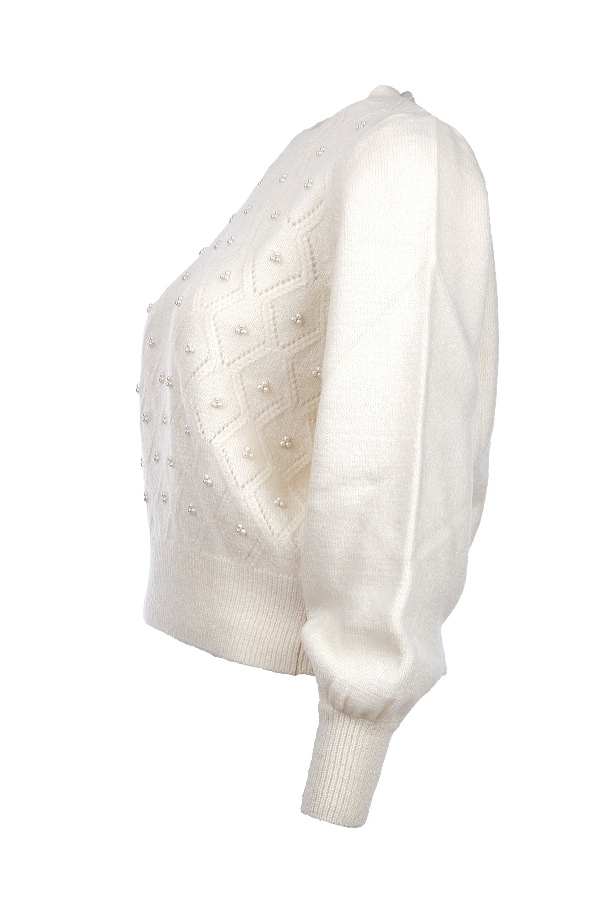On markasının şık ve modern kadın kazağıyla tanışın! Minimalist tasarımı, balon kolları ve zarif incili detaylarıyla dikkat...