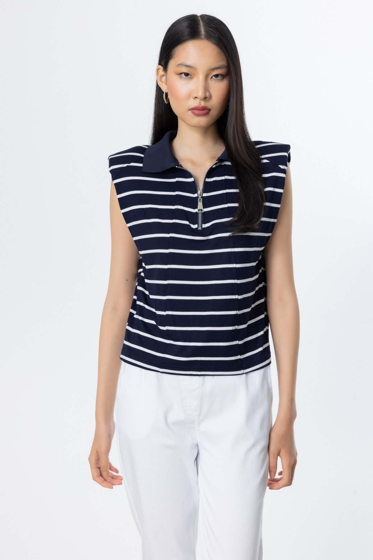 On Minimalist Çizgili Polo Yaka Kolsuz Crop Bluz - Yazlık Günlük Kombin