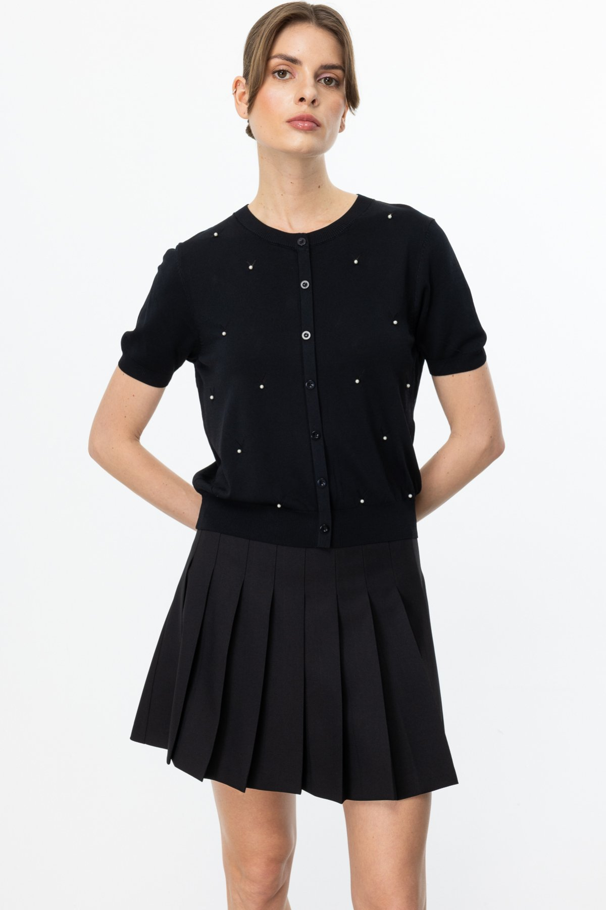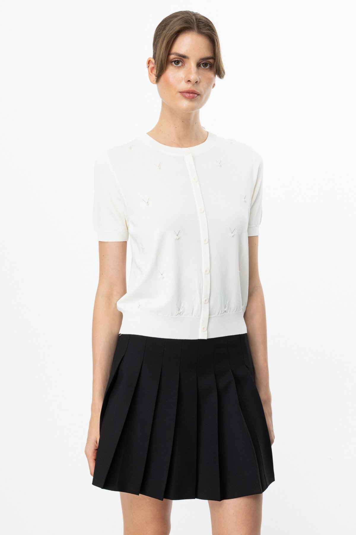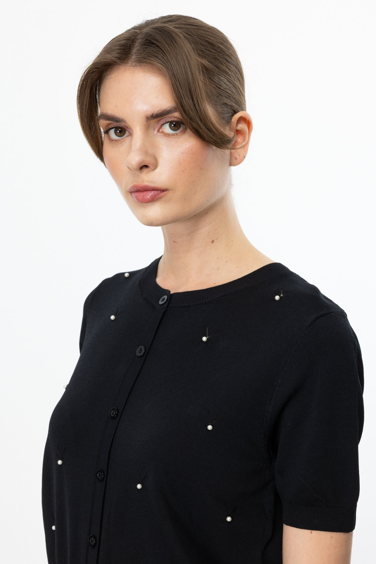On Minimalist İnci Detaylı Kısa Kol Kadın Bluz - Günlük & Özel Gün