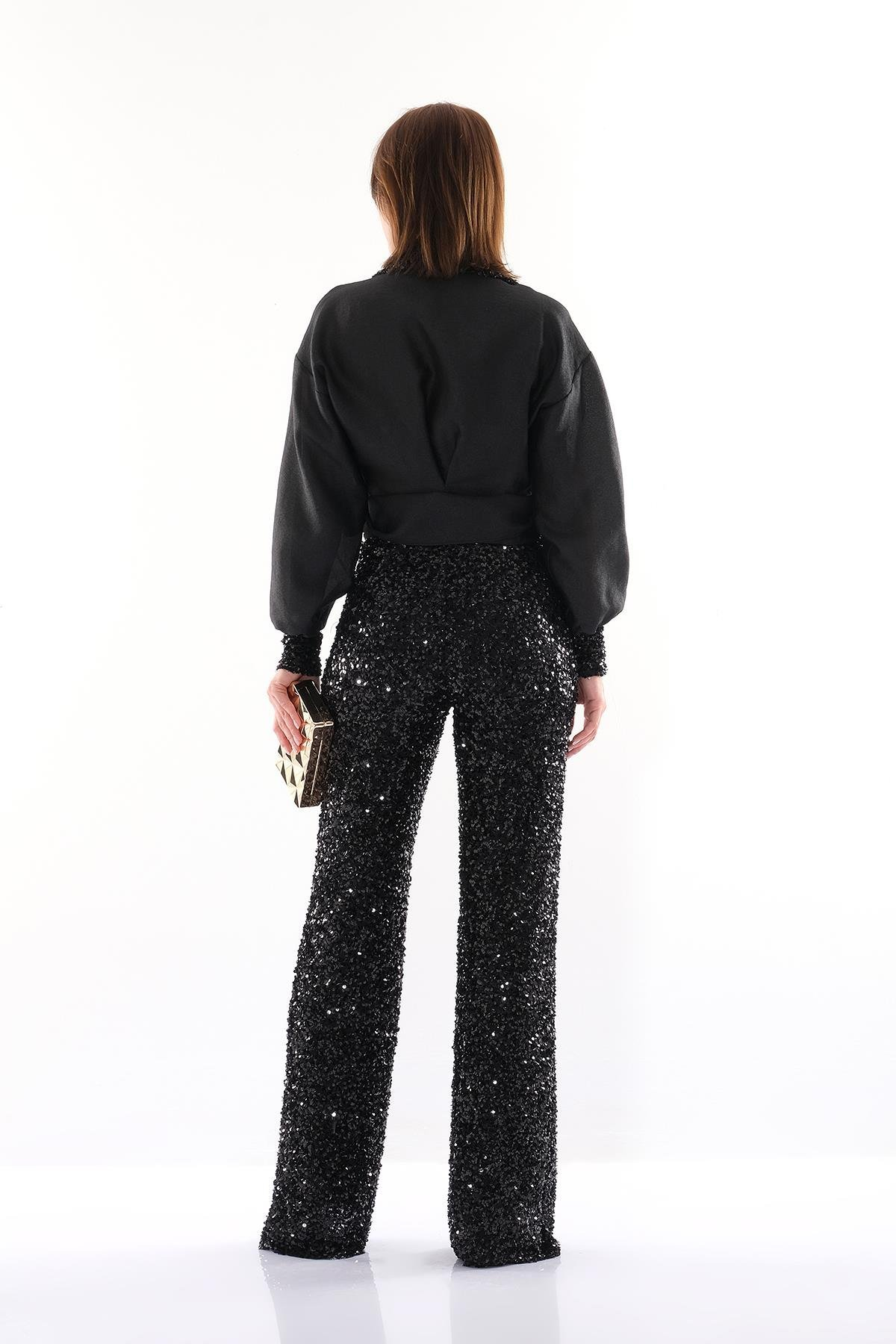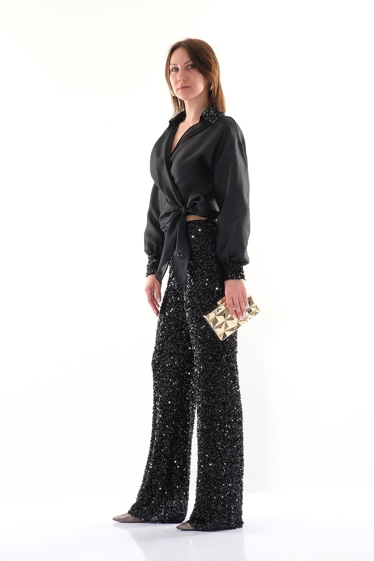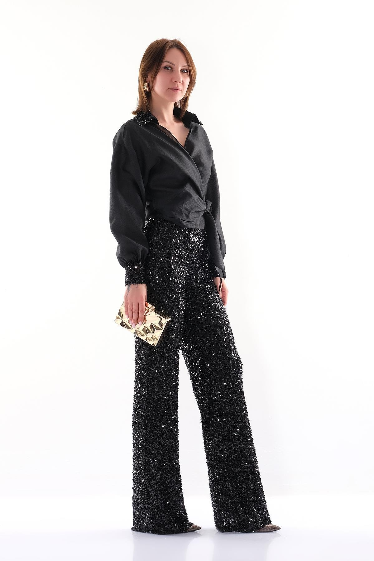 Organze Payet - Uzun Kollu - Yakalı - Gizli Fermuarlı - Payet Bol Paça Pantolon Bluz Takım.