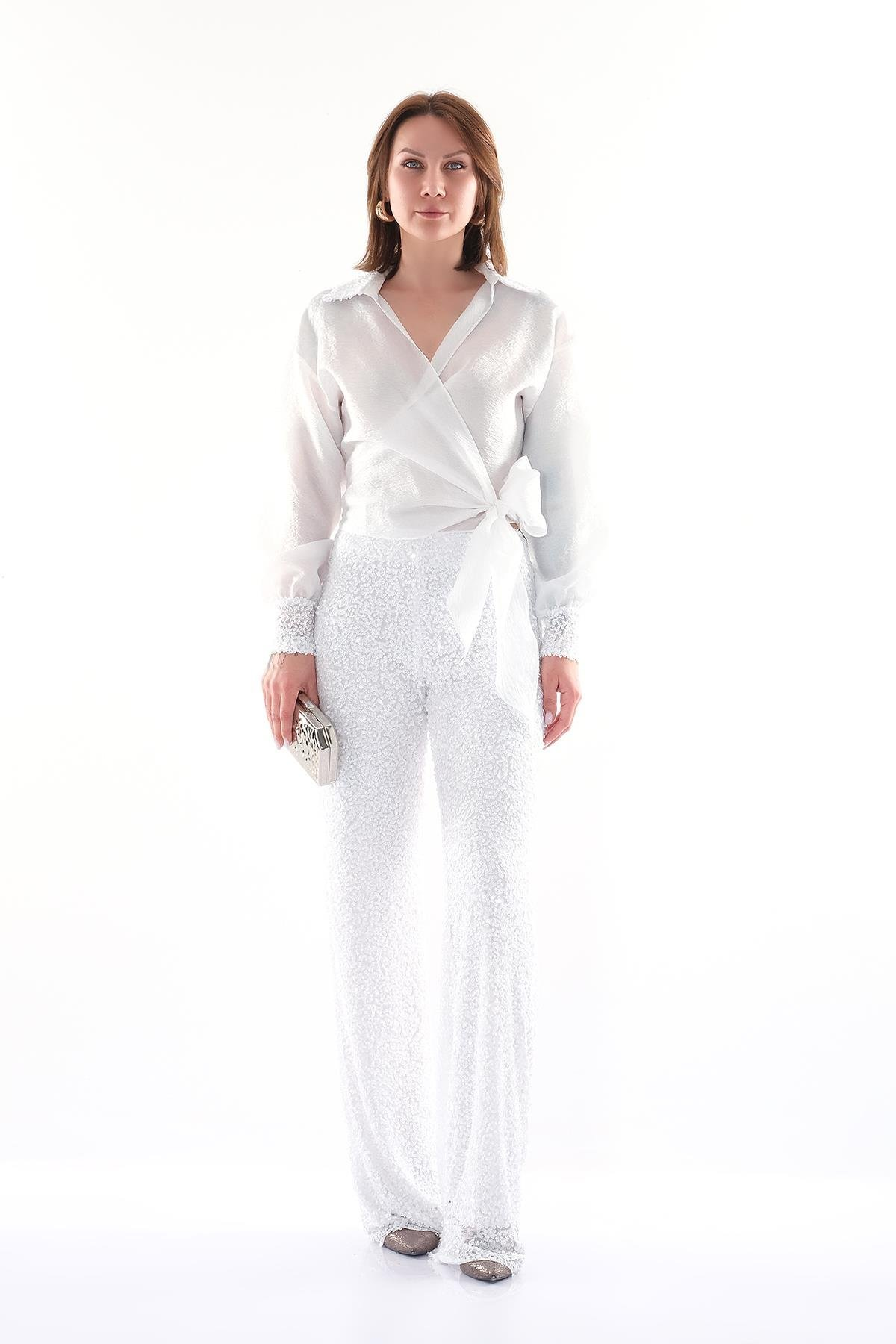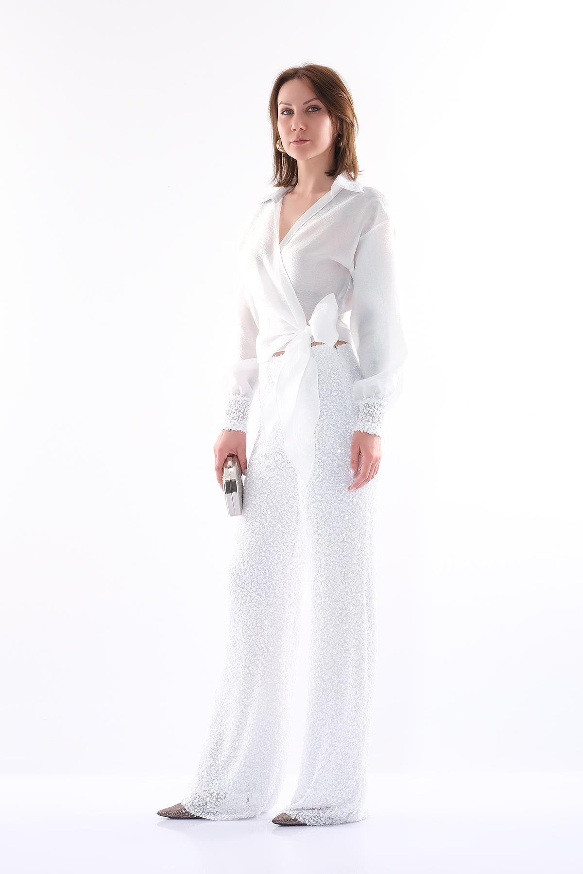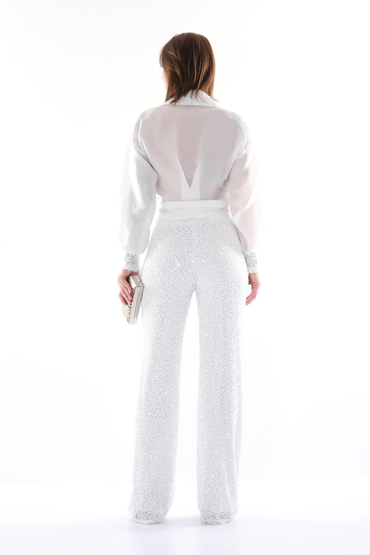 Organze Payet - Uzun Kollu - Yakalı - Gizli Fermuarlı - Payet Bol Paça Pantolon Bluz Takım.