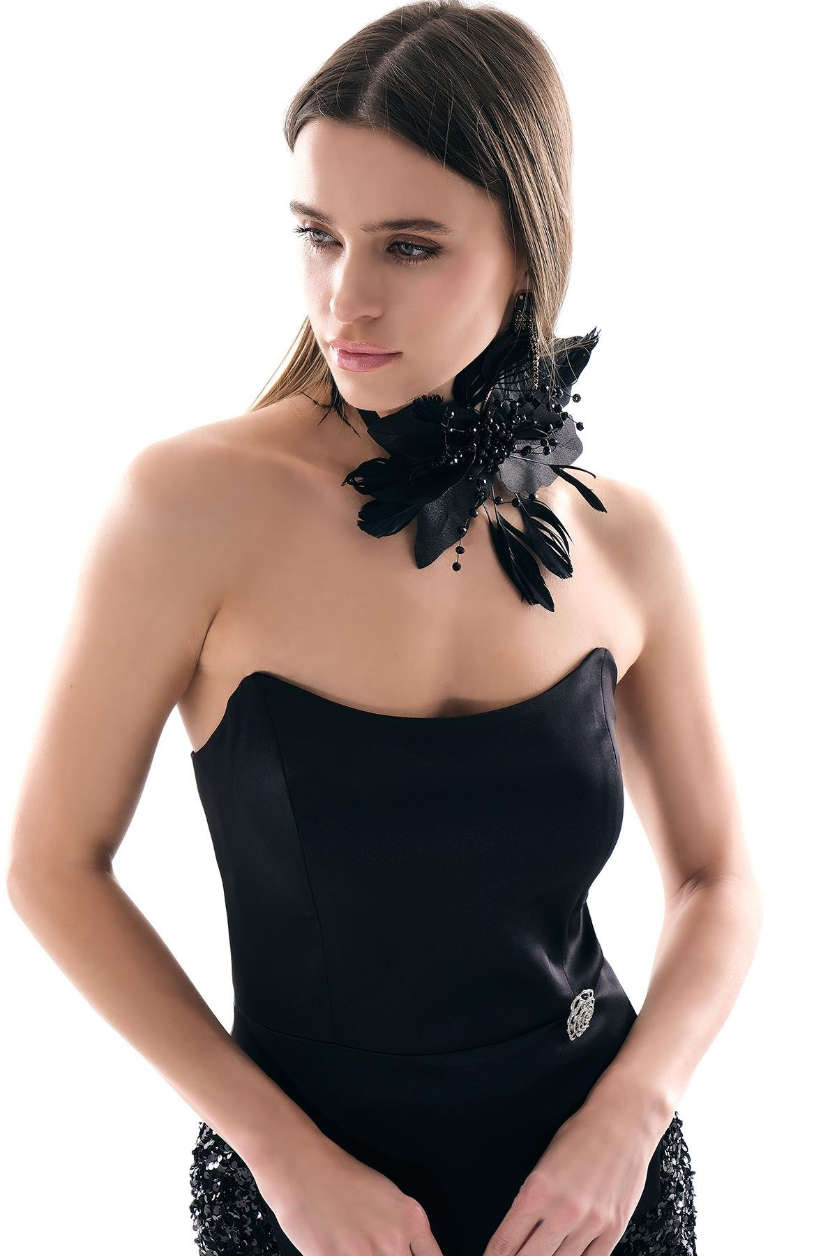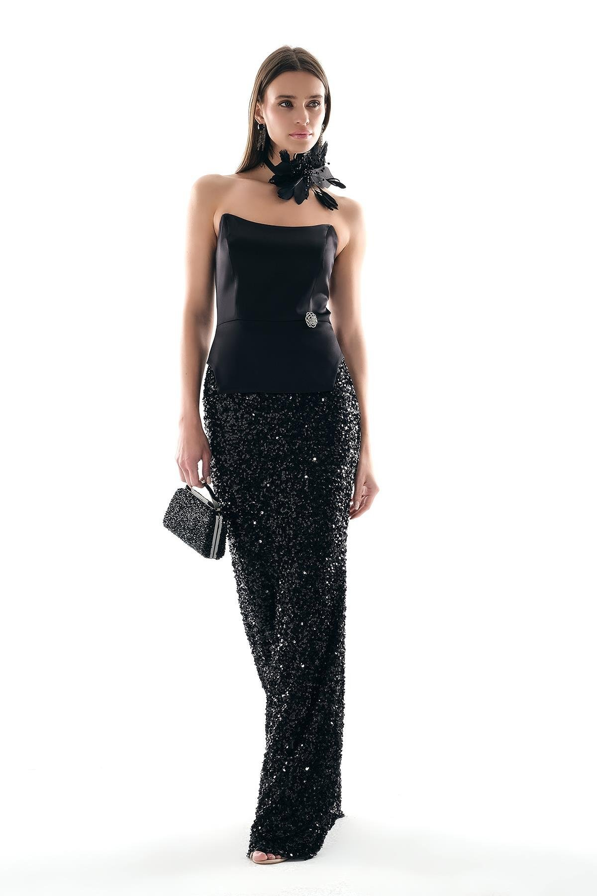 Saten Straplez Asimetrik Kesimli Gold Fermuarlı Bluz Payet Maksi Boy Etek Takım Explosion