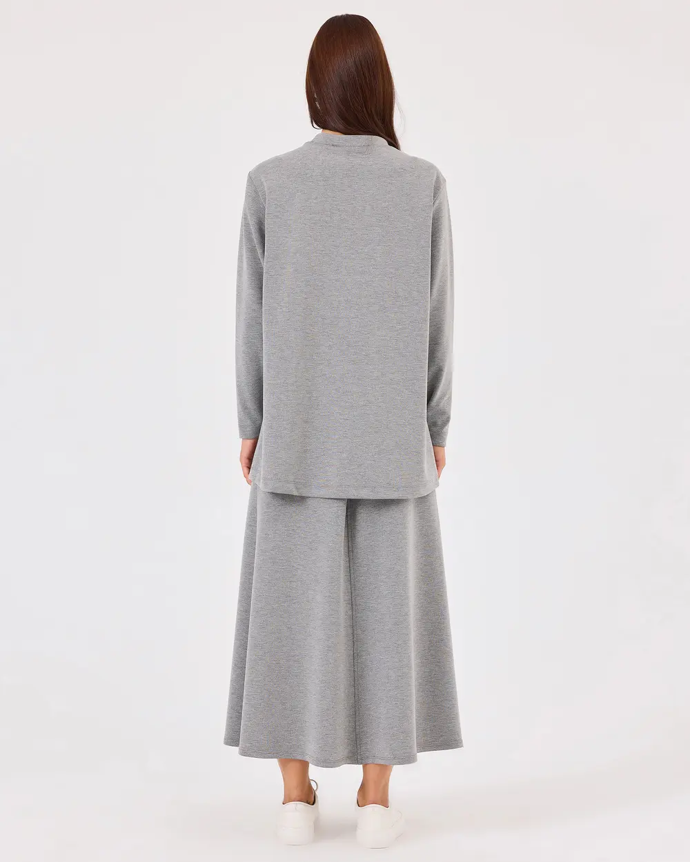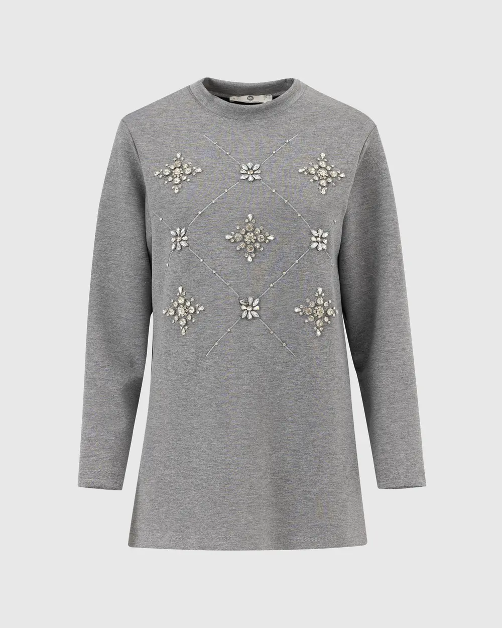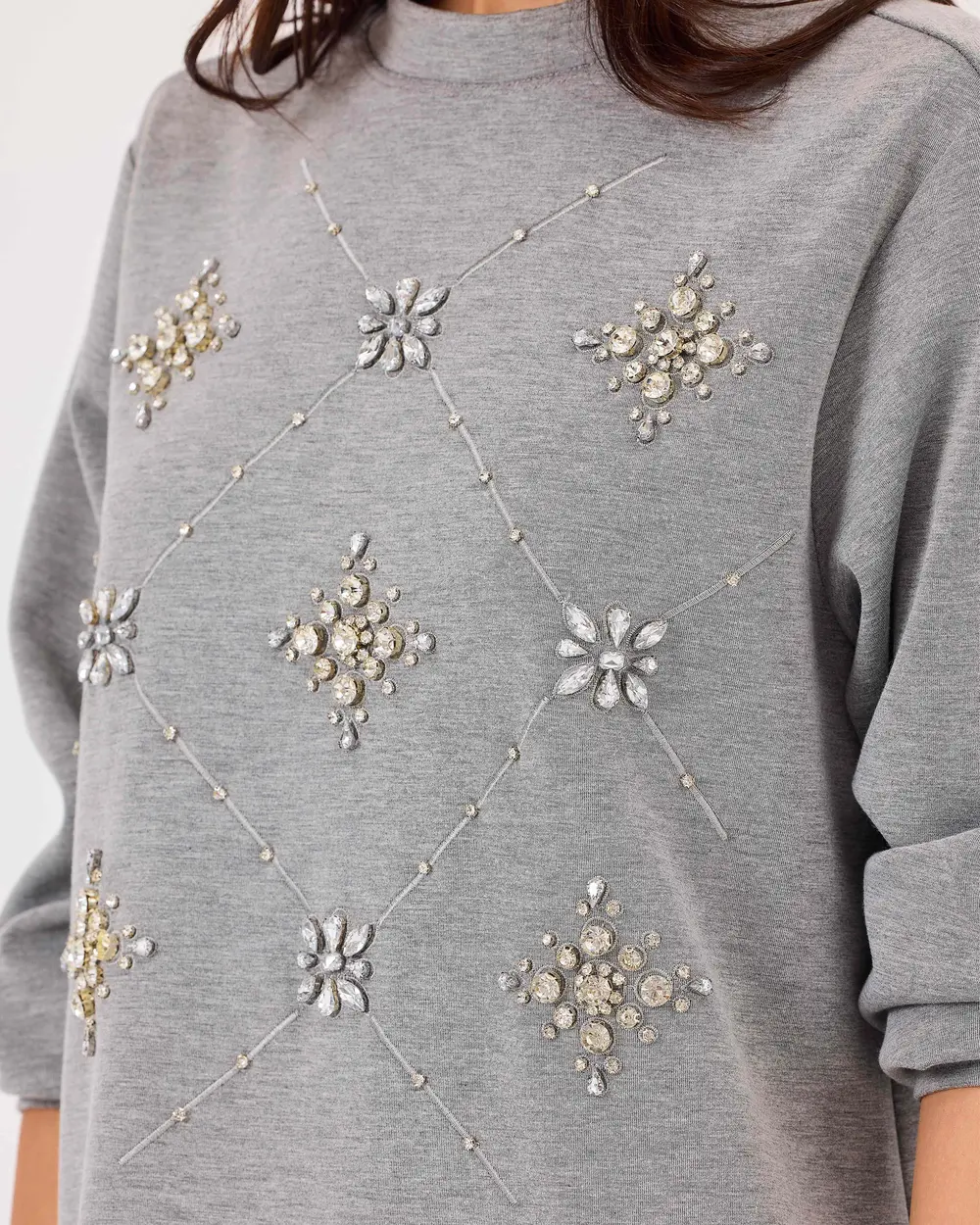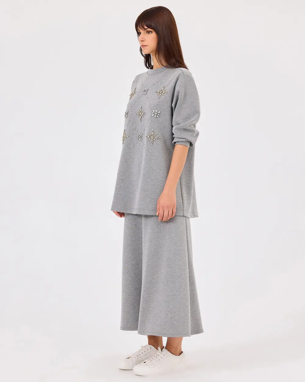 Yuvarlak Yaka Taşlı Sweatshirt, zarif taş detaylarıyla şıklık katarken, aynı kumaştan üretilmiş etek ile mükemmel bir kombin oluşturur.
