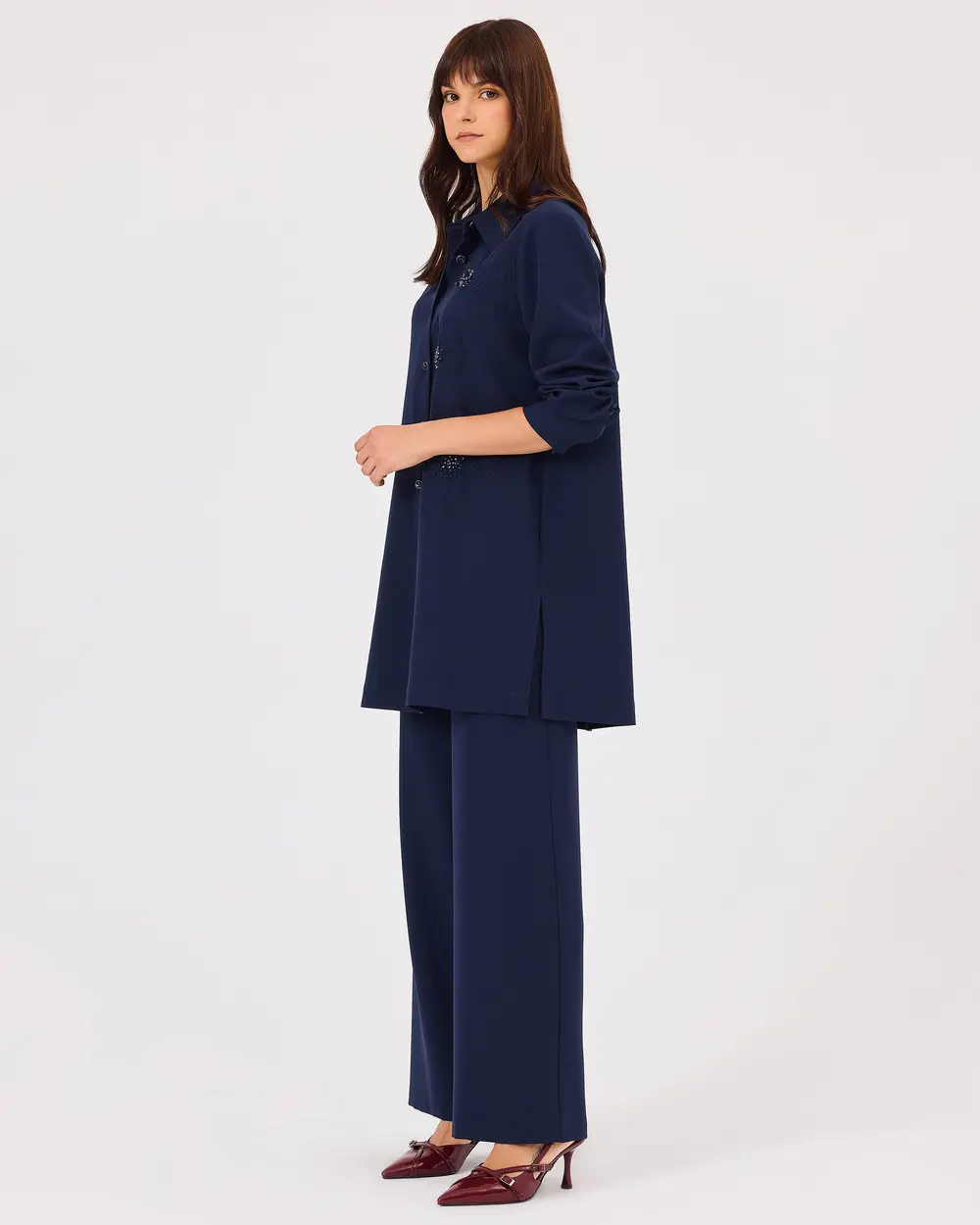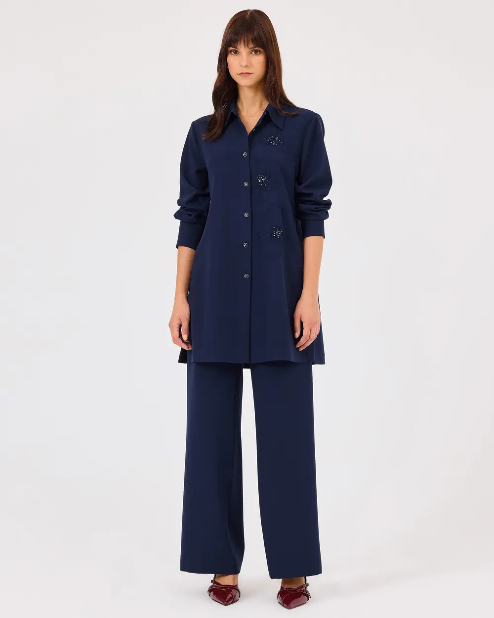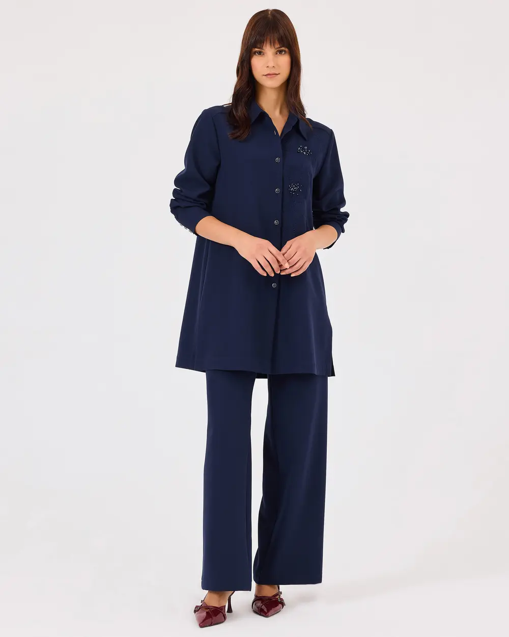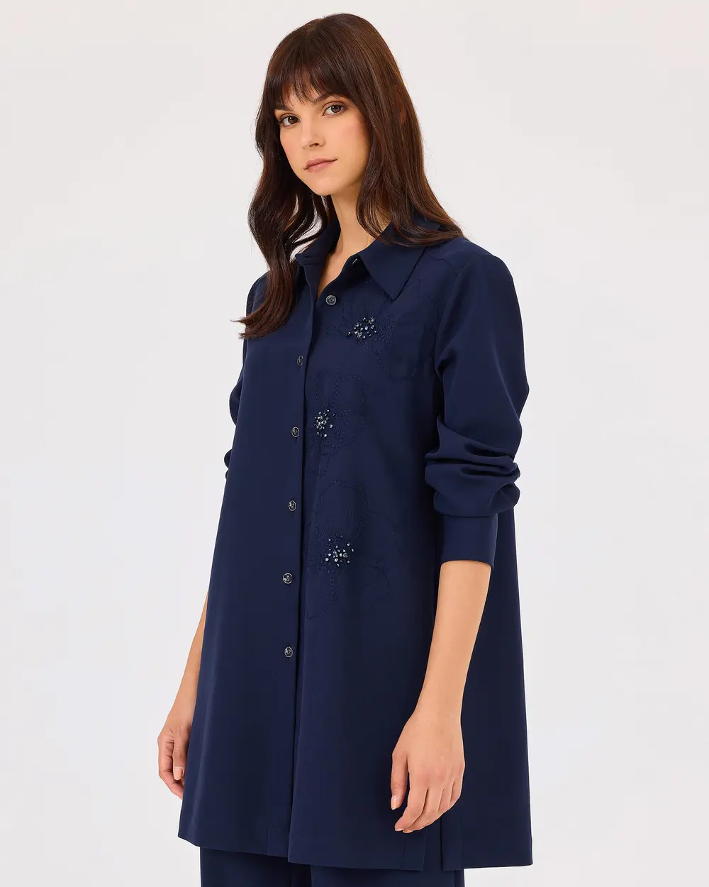 Boncuk Detaylı Düğmeli Uzun Kollu Tunik, zarif boncuk işlemeleriyle şıklık katar. Pantolon ile kombinleyerek hem günlük hem de iş stilinizi tamamlayabilirsiniz.;