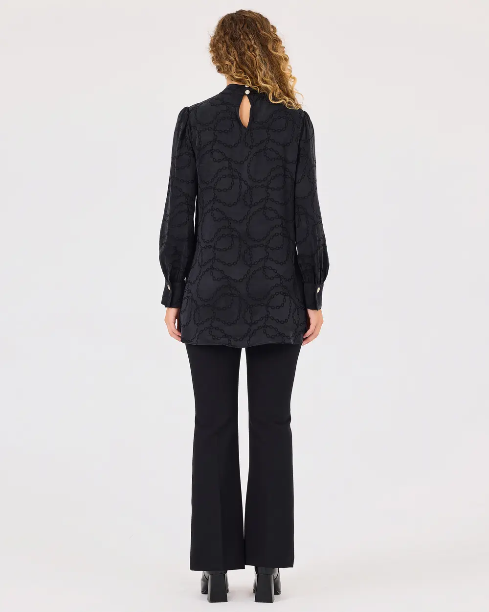 Dik Yaka Desenli Düğme Detaylı Tunik, şık zincir deseniyle göz alıcı bir stil sunar. Zarif düğme detaylarıyla birleşen modern tasarımı, her ortamda şıklığınızı vurgular.