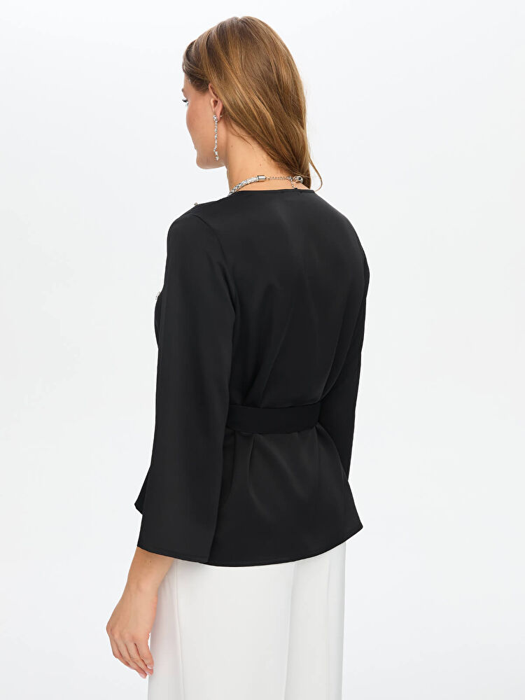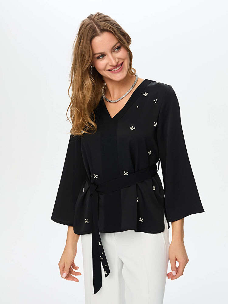 V Yaka Taş Ve Kuşak Detaylı Krep Saten Bluz Faik Sönmez